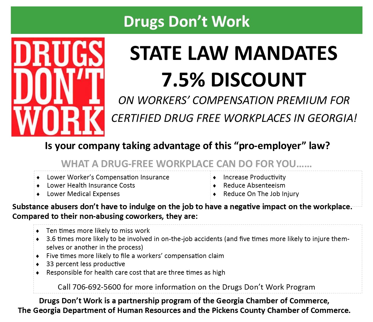 Employers in Georgia, certified by the state Board of Workers' Compensation as having a drug-free workplace, are entitled to a 7.5% discount on their workers' compensation premiums. It is designed to assist businesses in achieving drug-free certification. As a business member, you will have the opportunity to participate in a statewide drug-free workplace program established by the Georgia Chamber of Commerce.